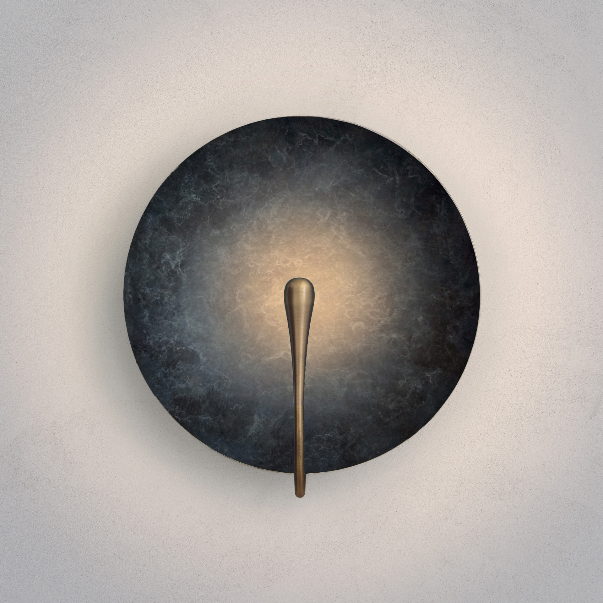 A mixed patina is meticulously applied to a hand-spun brass plate, resulting in a uniquely finished piece that also imparts a stunning stony touch. Softly illuminated from within by integrated LED elements, this sculptural wall piece adds an elegant touch to both contemporary and vintage-inspired interiors.