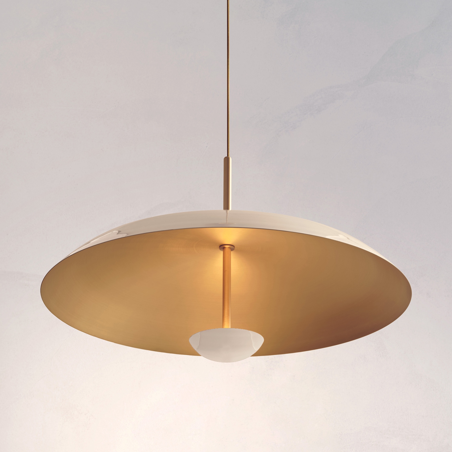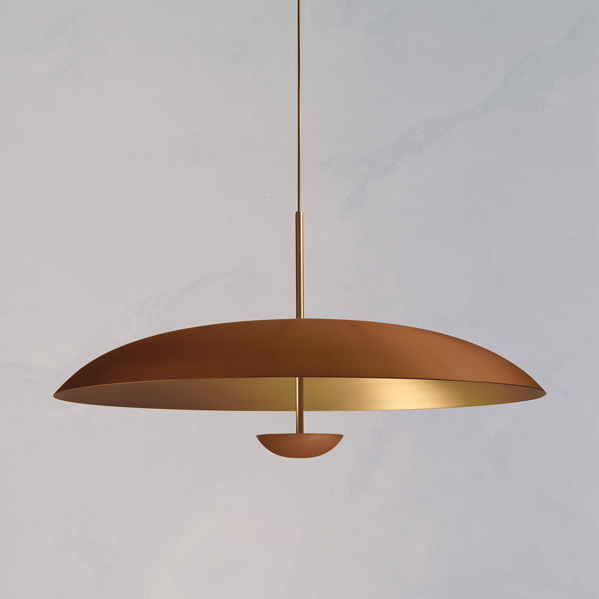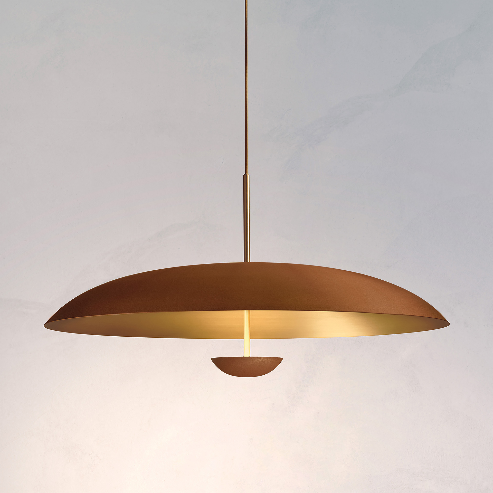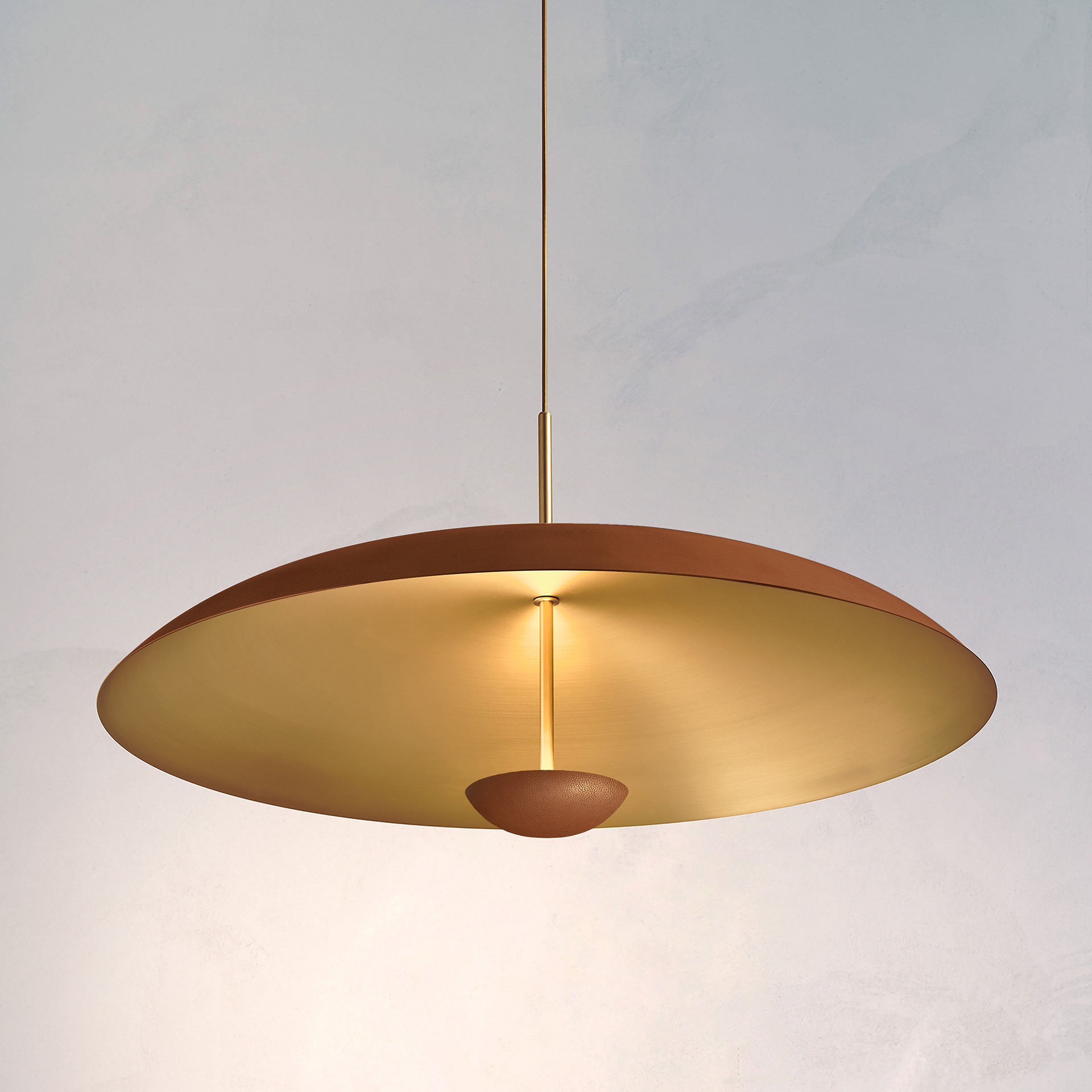This pendant light features handcrafted leather-wrapped brass plates. The light is projected into the shade and reflected outward, providing illumination without glare.