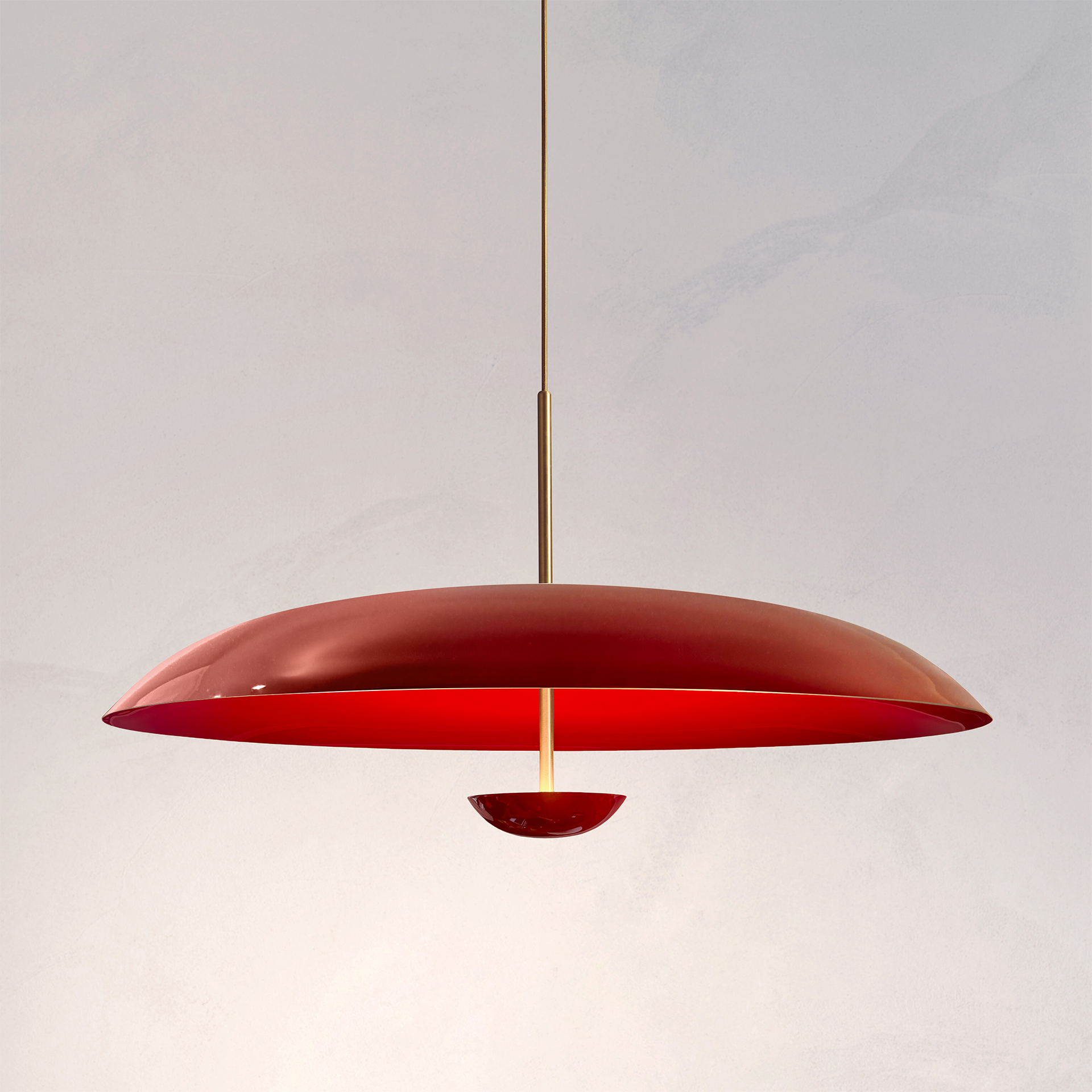 Two finely lacquered brass plates make up this pendant light. The light is projected into the shade and reflects outwards, illuminating without creating a glare.