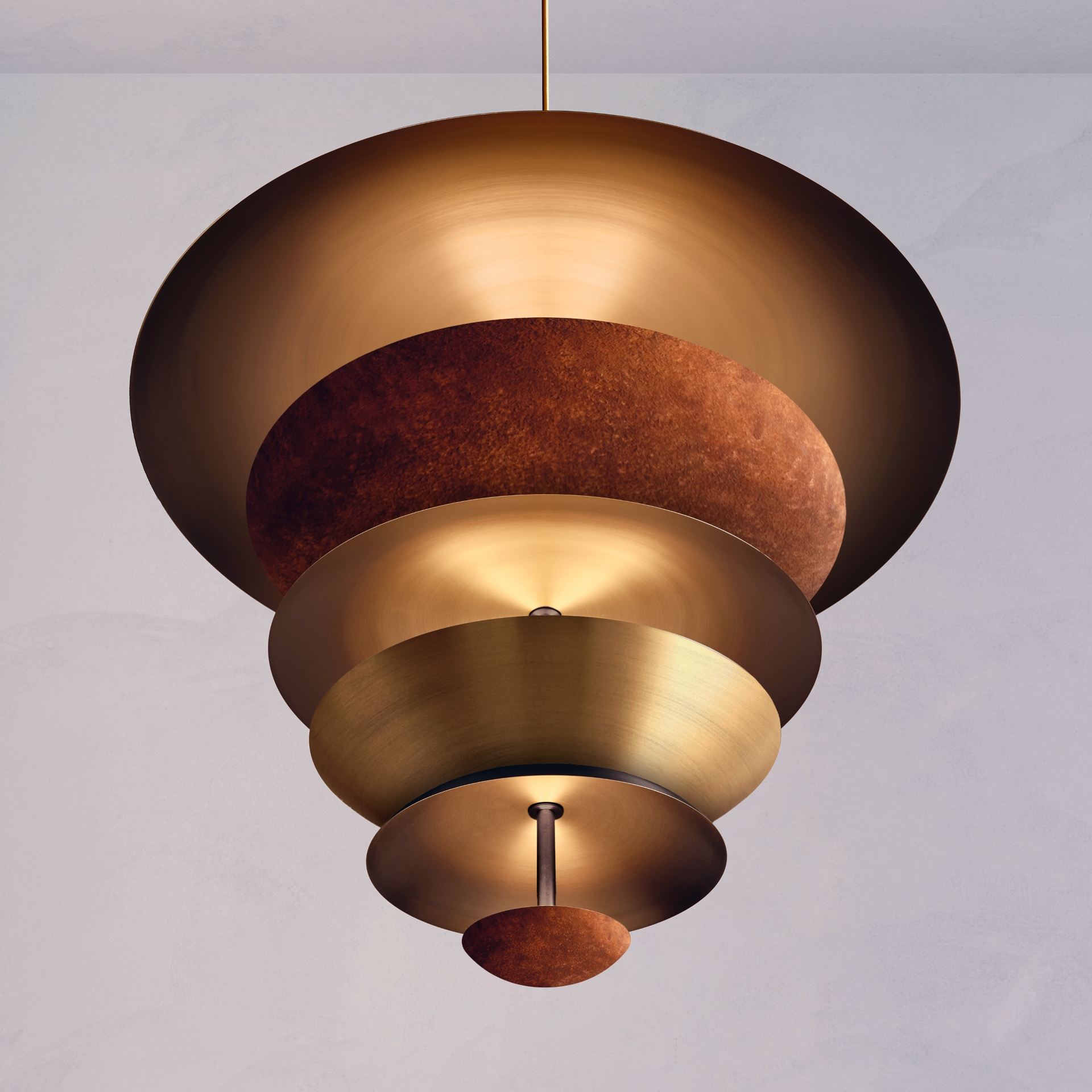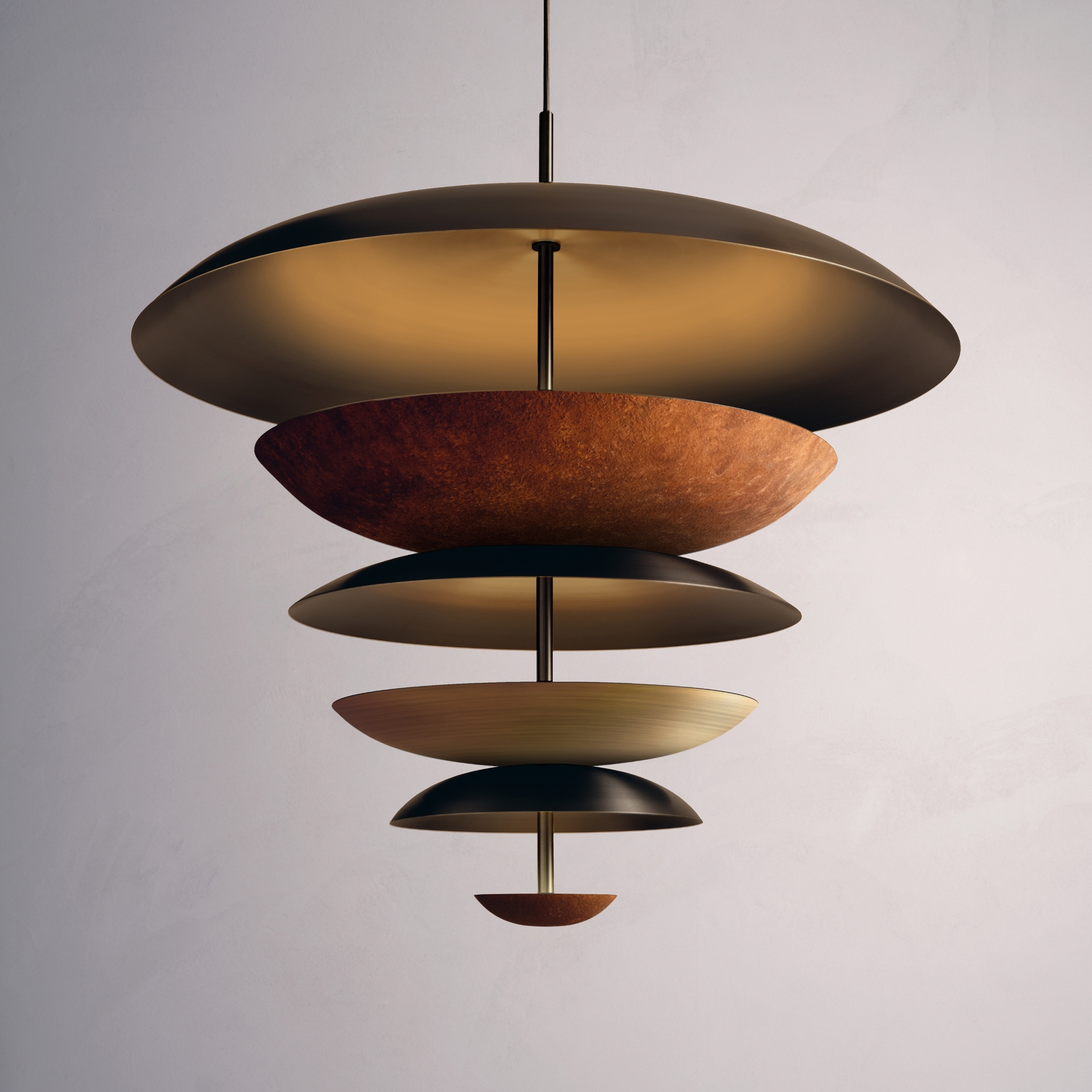 The Carousel Regolith Chandelier features six finely hand-spun brass plates, finished in a combination of Rust patina with Dark bronze and medium bronze to create its individual appearance. The light is projected into the shade and reflects out, illuminating without creating a glare.