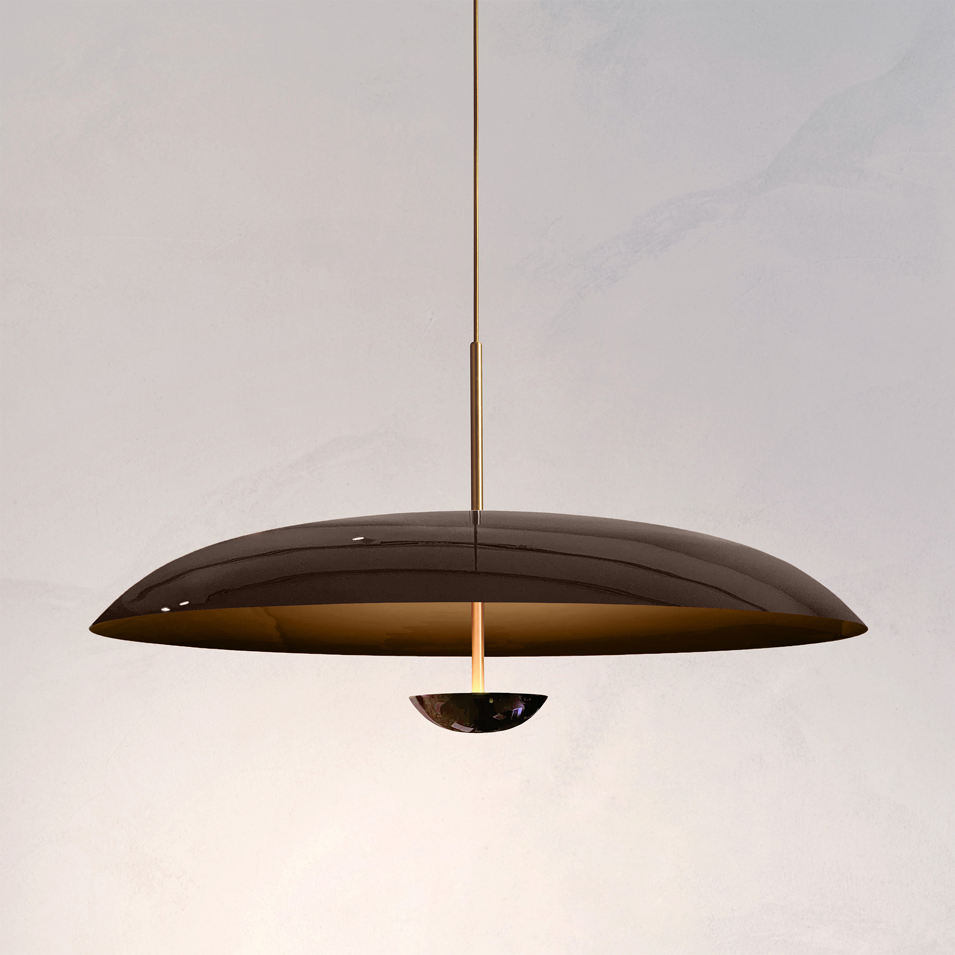 Two finely lacquered brass plates make up this pendant light. The light is projected into the shade and reflects outwards, illuminating without creating a glare.