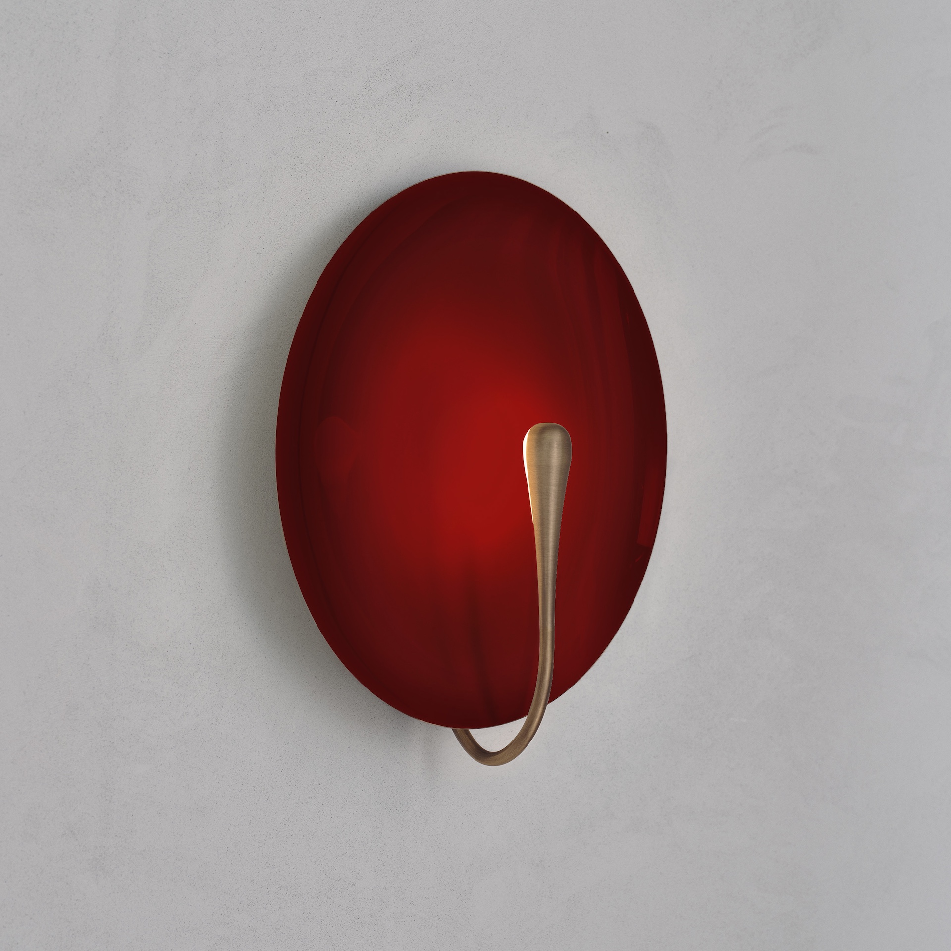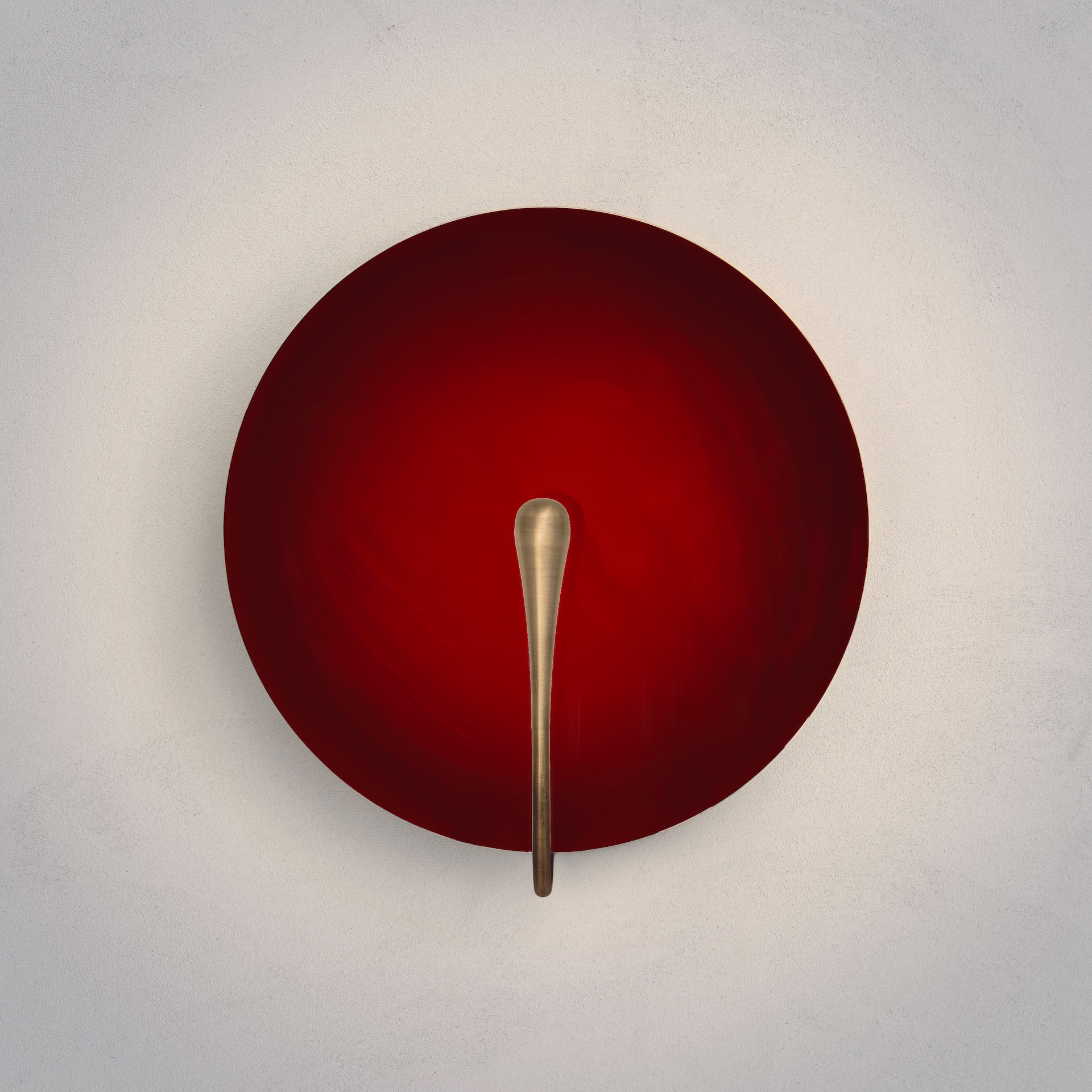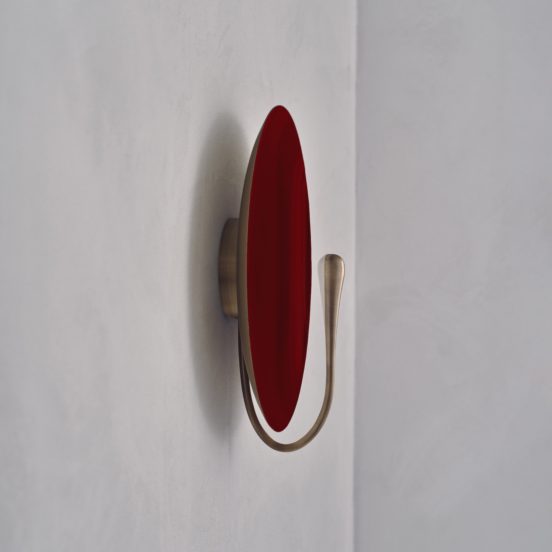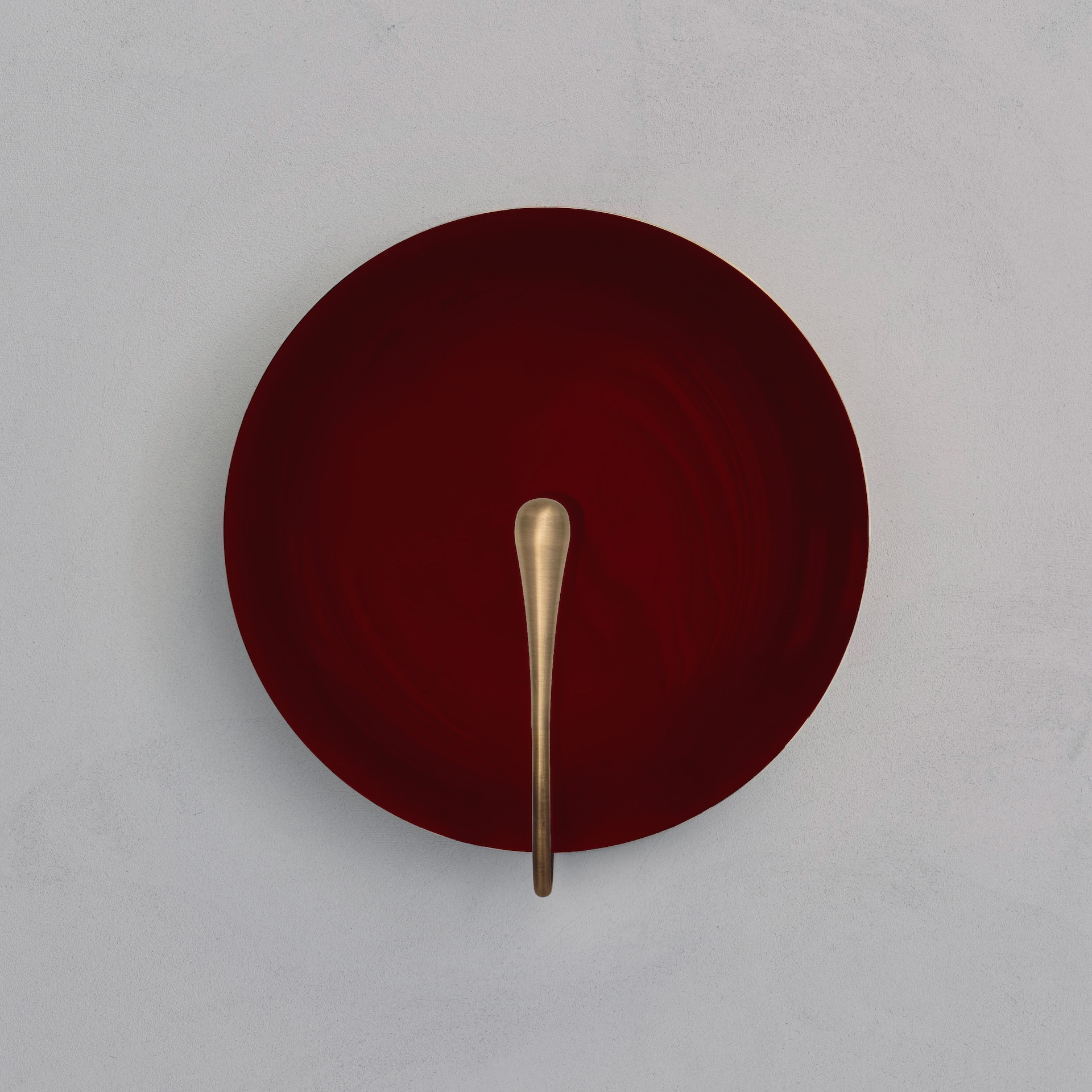 The rim and the back of the shade are finished in satin brass, whilst the inner surface is hand-lacquered in a polished maroon finish. Please note that each piece is individually handmade, therefore unique in its own way.