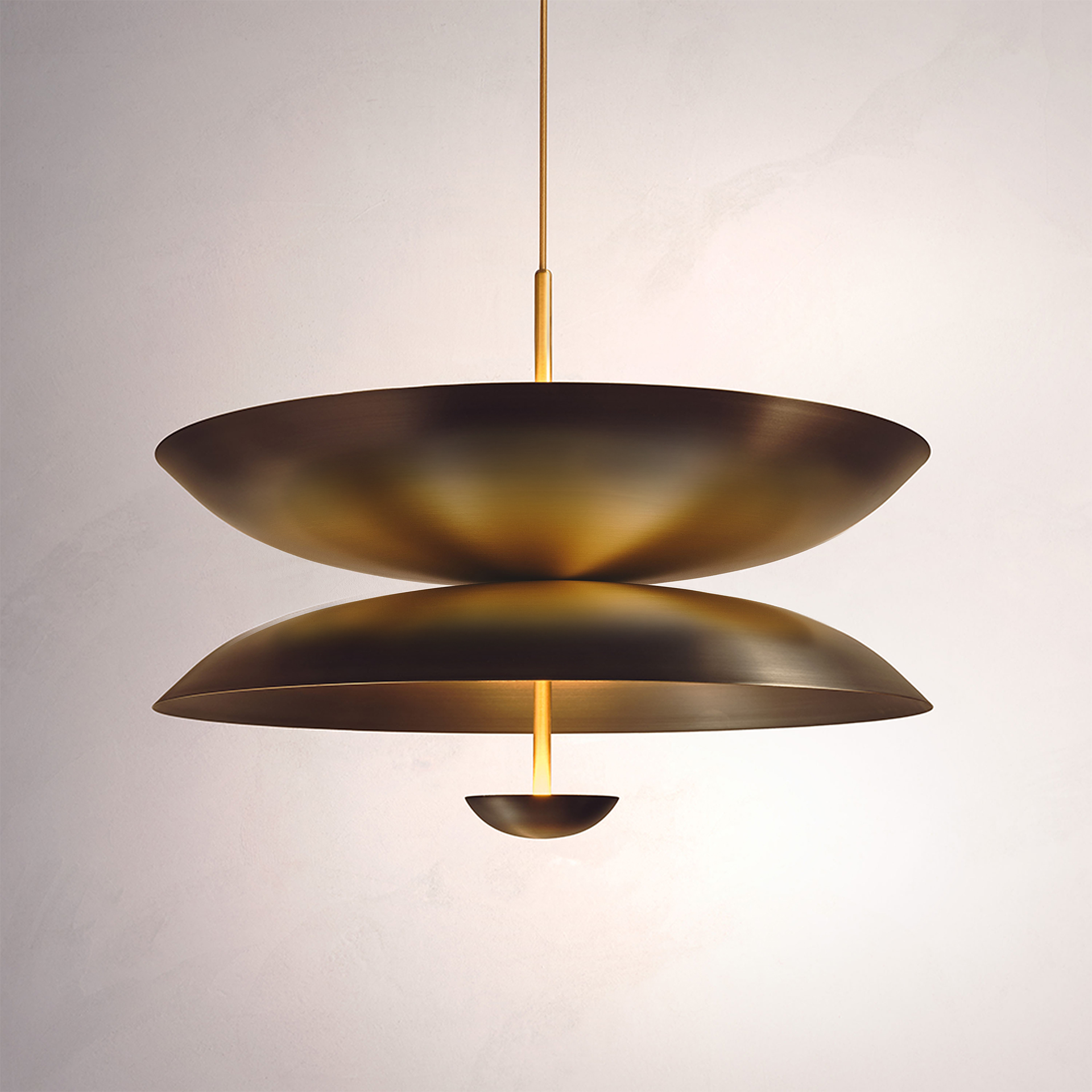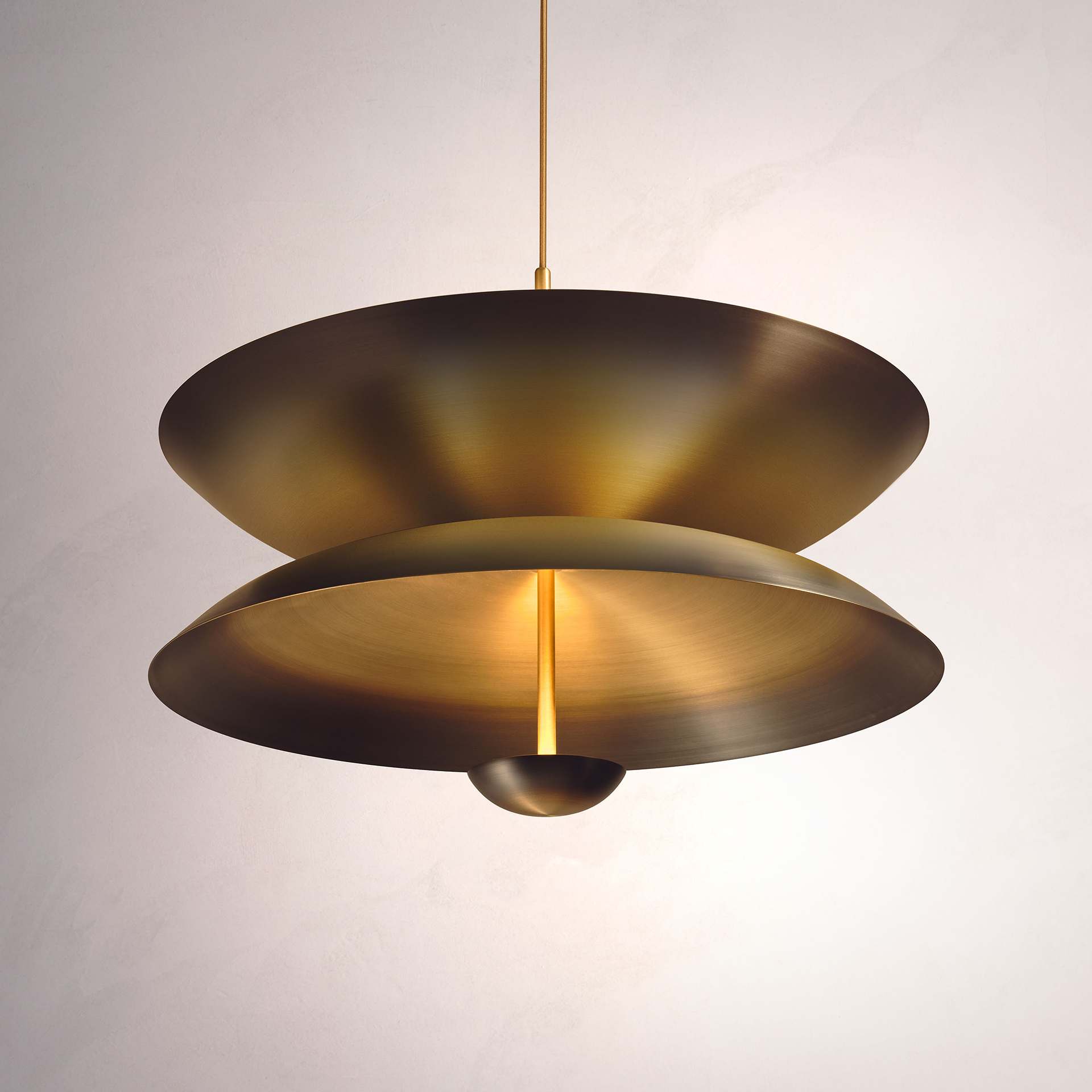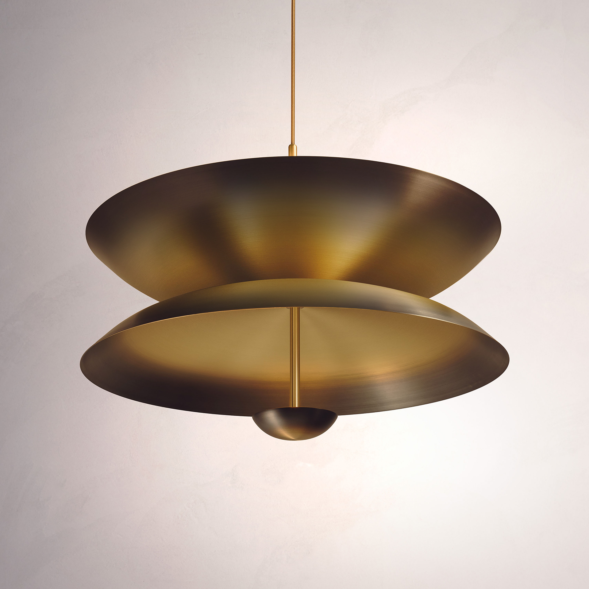 Composed with three carefully hand-spun brass plates, our Ore pendant is finished with a mixed patina to create this unique appearance. The light is projected into the shade and reflects out, illuminating without creating a glare.