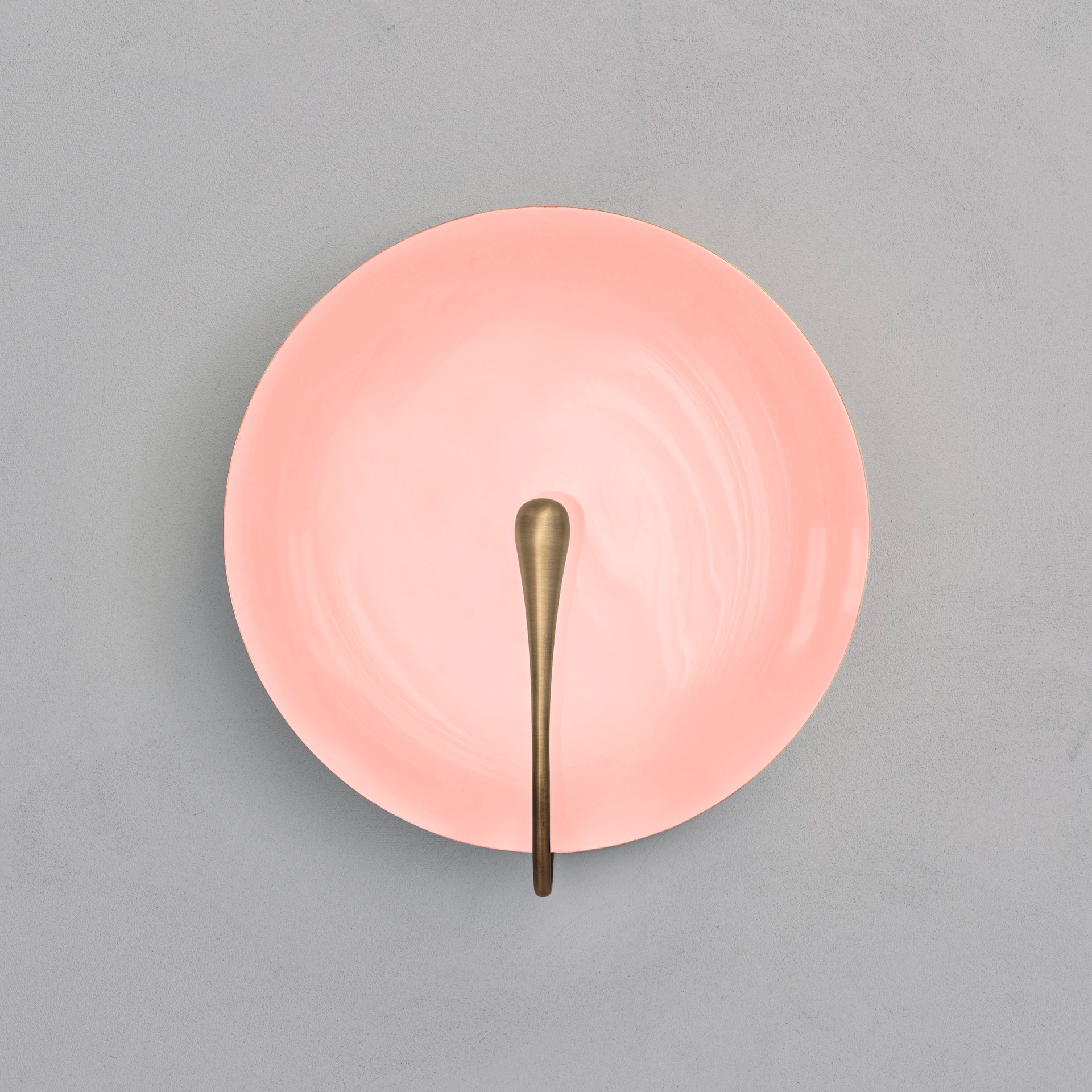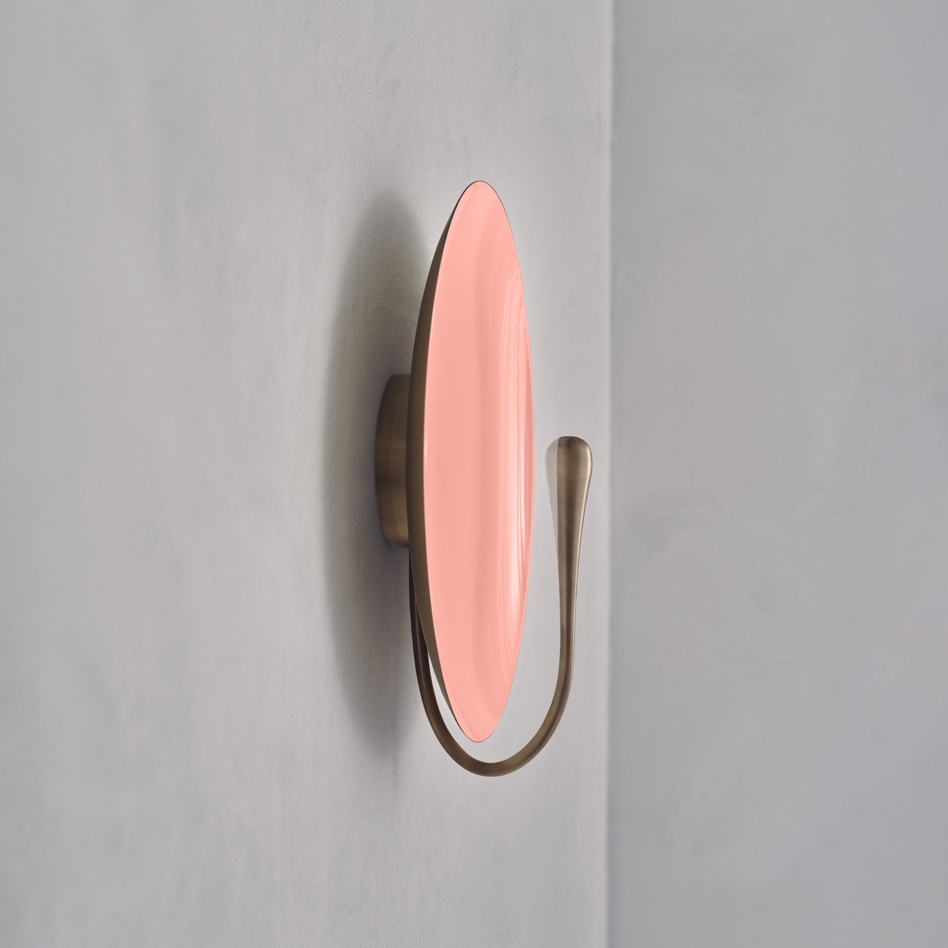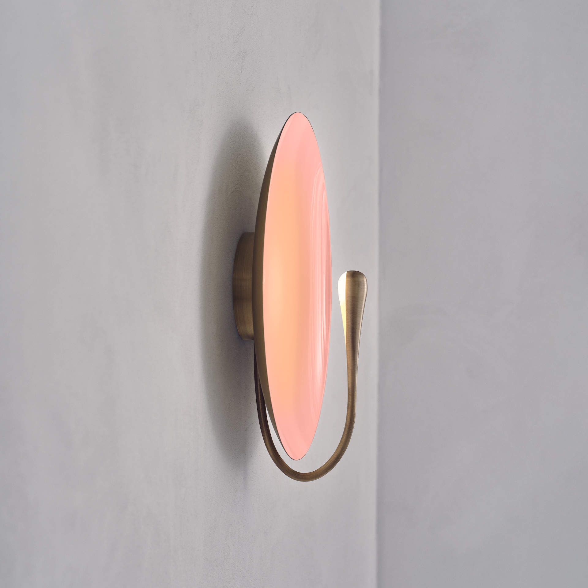 The rim and the back of the shade are finished in satin brass, whilst the inner surface is hand-lacquered in a gloss rose finish. Please note that each piece is individually handmade, therefore unique in its own way.