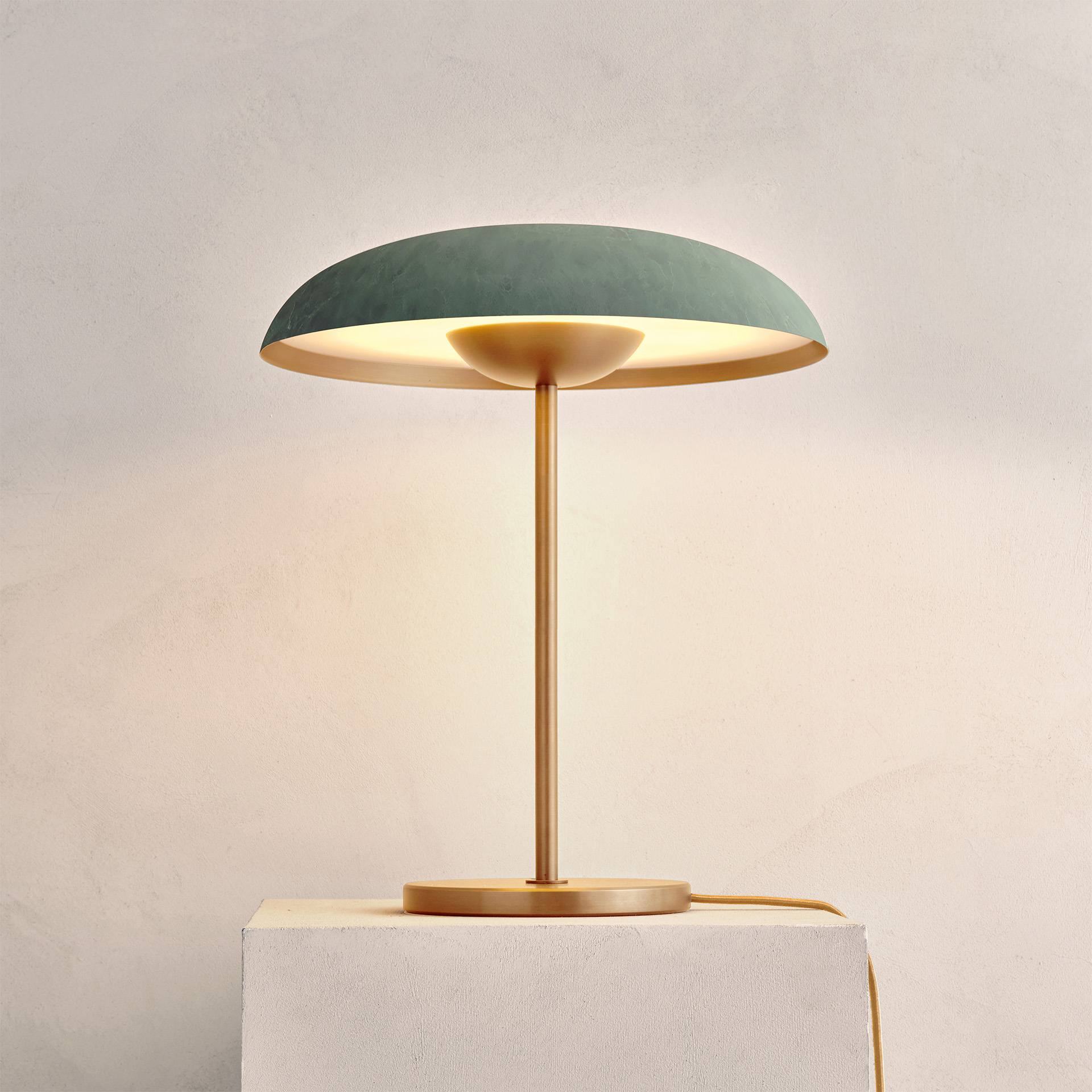 Handcrafted with Verdigris patinated brass plates and a leather-wrapped stem, the Solstice Verdigris table light forms a distinctive and gentle silhouette. Softly illuminated by integrated LED elements from within, it casts a subtle and inviting glow.