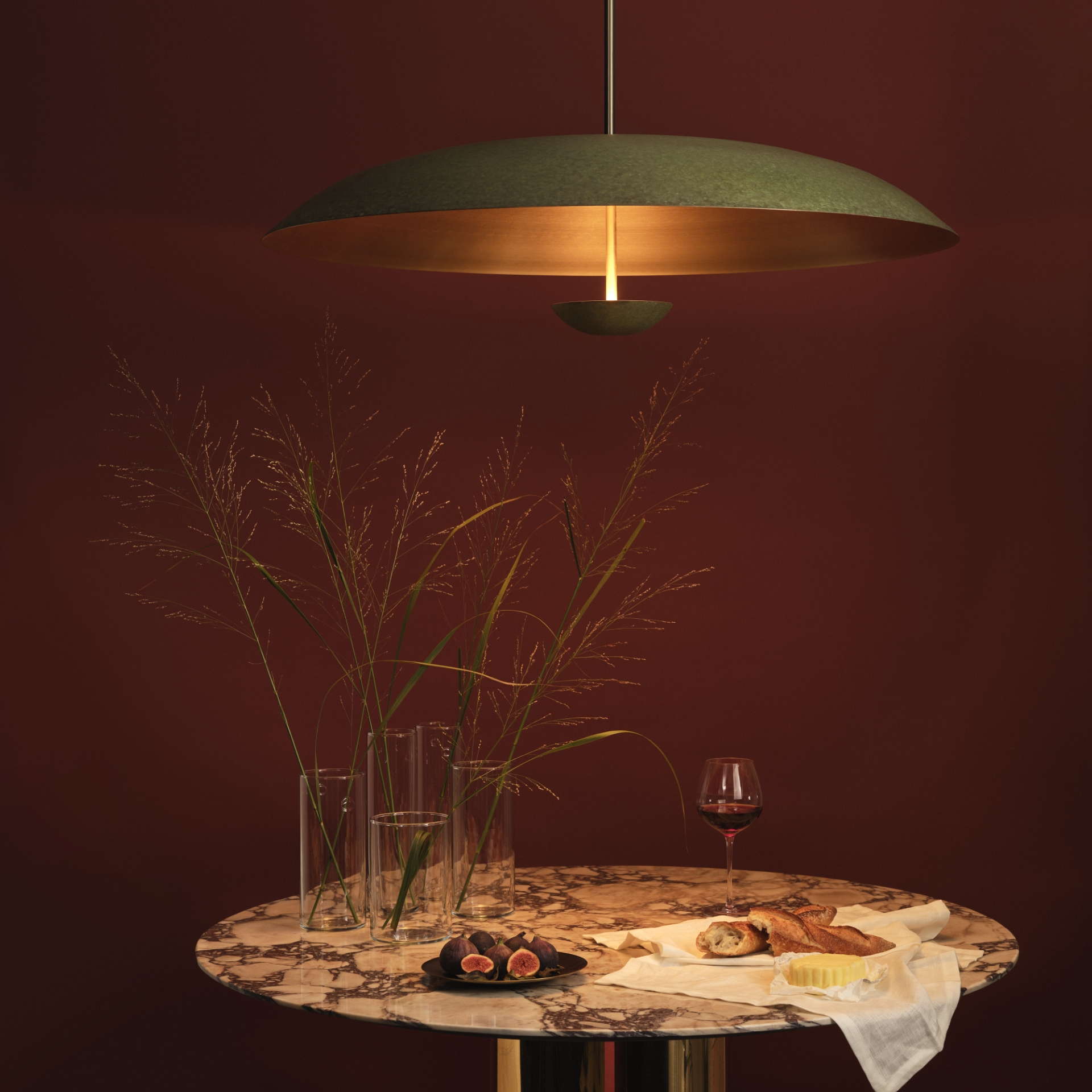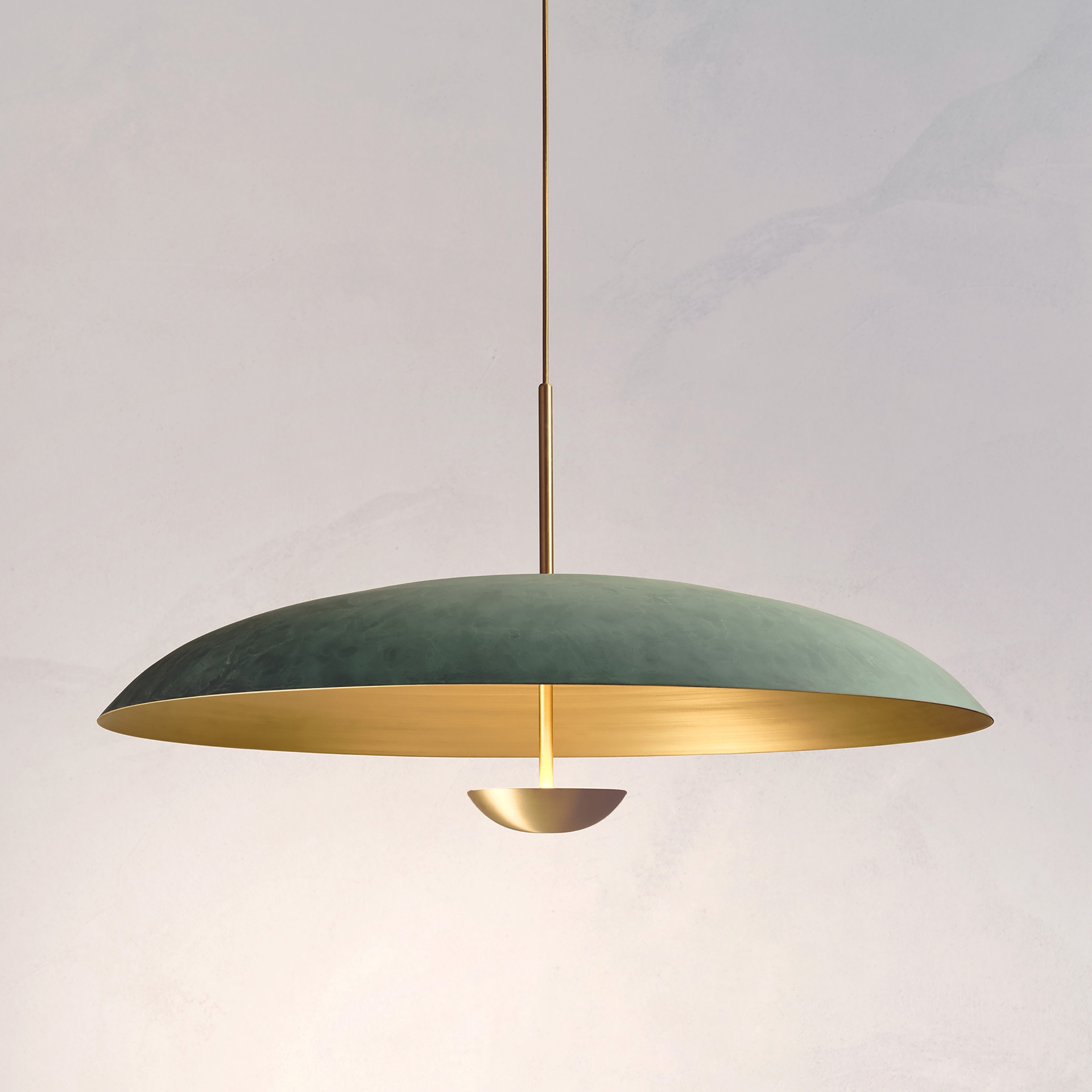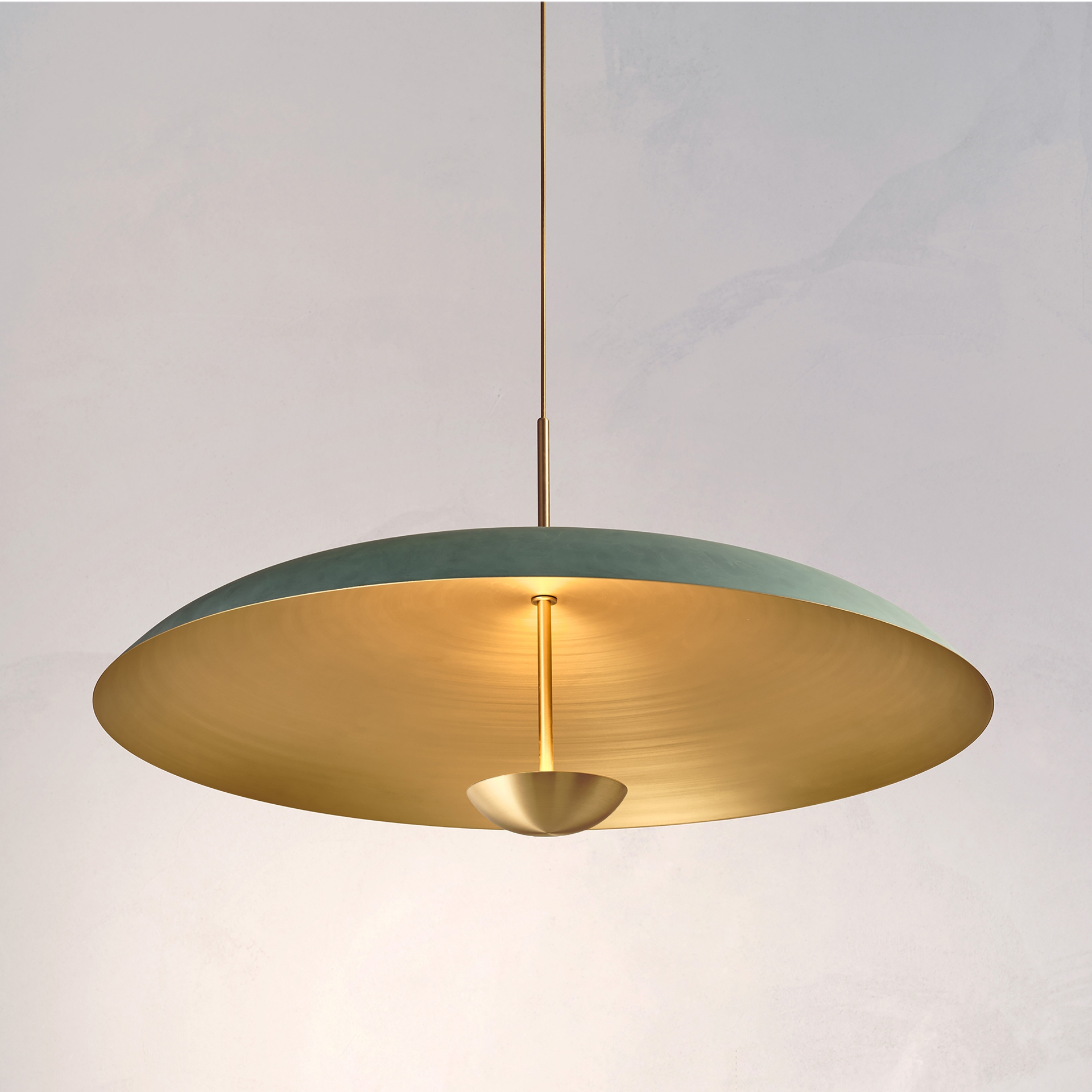 An one-off artisanal patina is applied on two hand-spun brass plates to create this unique pendant light.